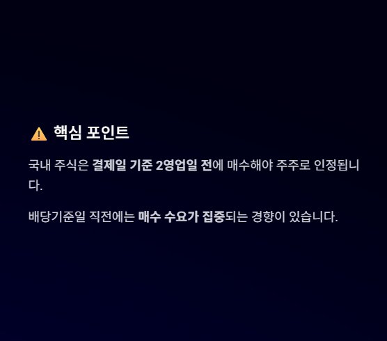 국내 주식은 보통 2영업일 전에 매수해야 주주로 인정됩니다.