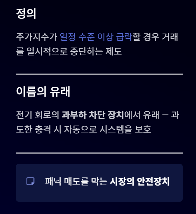 - 서킷 브레이커 → 시장 전체 거래 중단