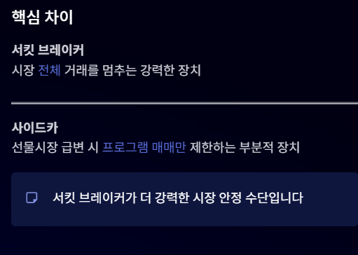 즉 서킷 브레이커가 더 강력한 시장 안정 장치라고 볼 수 있습니다.