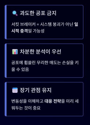 서킷 브레이커는 시장의 위험 신호이기도 합니다. 하지만 동시에 장기 투자자에게는 시장 상황을 다시 분석할 수 있는 기회가 되기도 합니다.