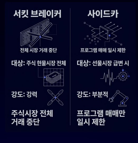 서킷 브레이커는 주식시장 전체 거래를 중단하는 제도입니다. 반면 사이드카는 선물 시장의 급격한 변동이 발생했을 때 프로그램 매매를 일시적으로 제한하는 장치입니다.