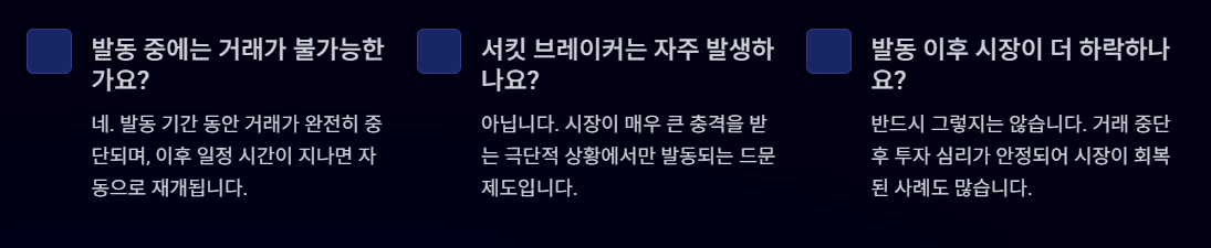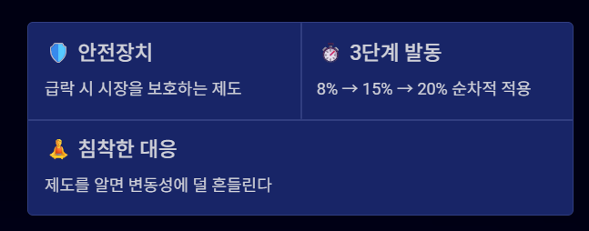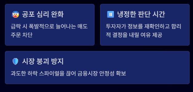 즉, 시장이 일시적으로 멈추는 동안 투자자들이 정보를 다시 확인하고 합리적인 판단을 할 수 있도록 시간을 주는 장치라고 이해하면 쉽습니다.