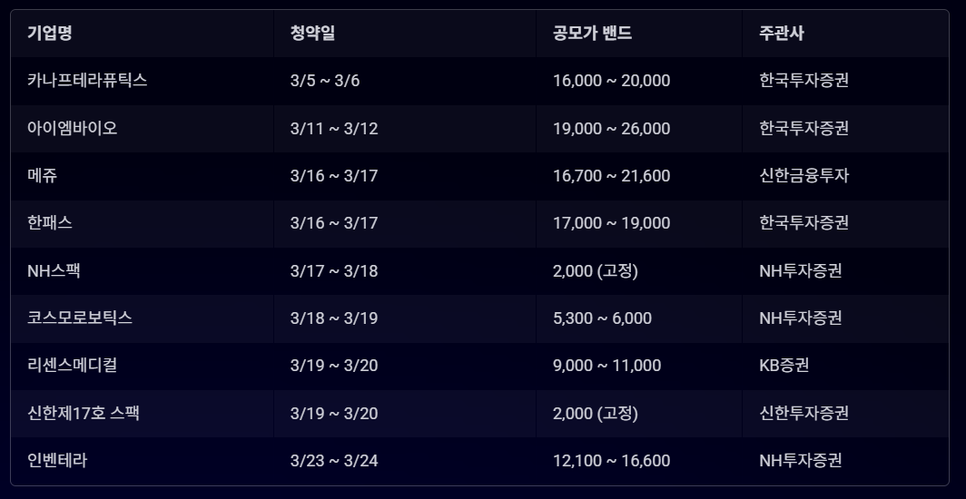 3월 공모주 시장에는 다양한 기업들이 상장을 준비하고 있으며, 청약 일정은 다음과 같습니다.