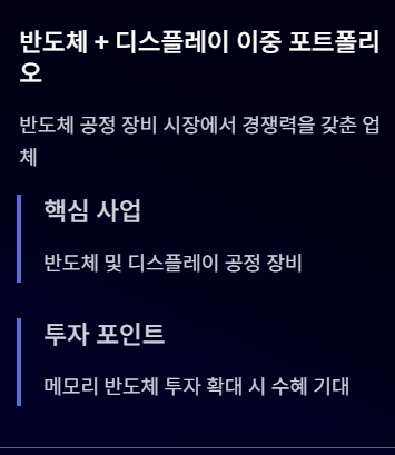 반도체와 디스플레이 장비 사업을 진행하는 기업으로 반도체 공정 장비 시장에서 경쟁력을 갖춘 업체 중 하나입니다.