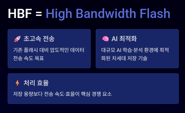 HBF는 High Bandwidth Flash의 약자로, 기존 플래시 메모리보다 훨씬 높은 데이터 전송 속도를 목표로 하는 차세대 저장 기술을 의미합니다.