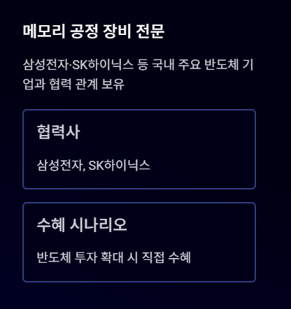 삼성전자와 SK하이닉스 등 주요 반도체 기업과의 협력 관계로 인해 반도체 투자 확대 시 수혜 기대가 있는 기업입니다.