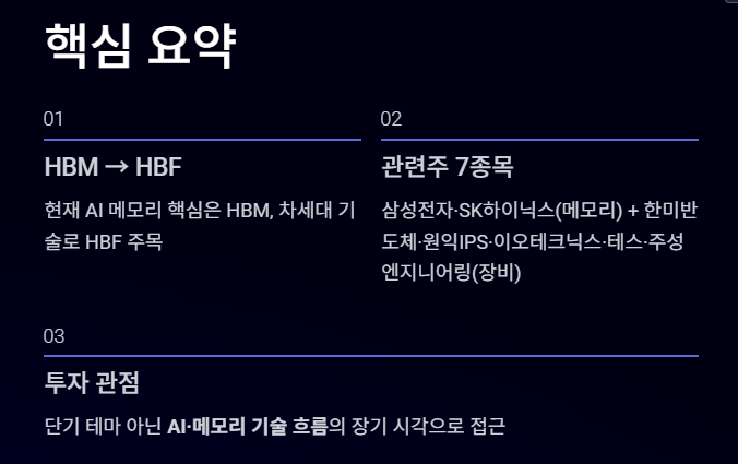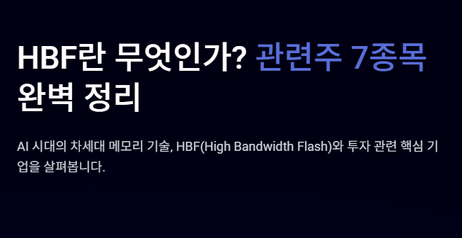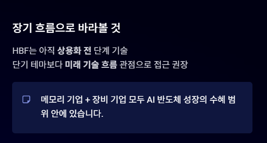 HBF는 아직 상용화 단계에 있는 기술이 아니기 때문에 단기적인 투자 테마로 보기보다는 미래 기술 흐름 관점에서 보는 것이 좋습니다.