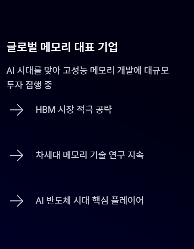 특히 AI 시대가 시작되면서 고성능 메모리 개발에 많은 투자를 진행하고 있으며, HBM 시장에서도 적극적인 움직임을 보이고 있습니다. 차세대 메모리 기술 연구 역시 지속적으로 진행하고 있어 AI 반도체 시대에서 중요한 역할을 할 가능성이 있습니다.