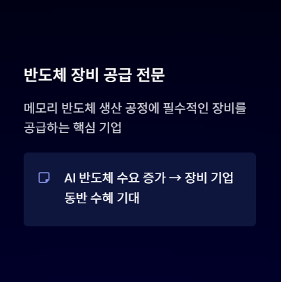 이러한 흐름이 이어진다면 메모리 기업뿐 아니라 반도체 장비 기업들도 함께 수혜를 받을 가능성이 있습니다.