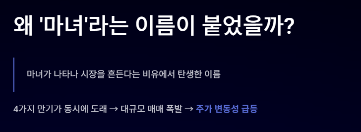 이 네 가지 상품의 만기가 같은 날에 동시에 도래하면서 대규모 매매가 발생하고, 그 결과 주가 변동성이 커질 가능성이 높은 날을 의미합니다.