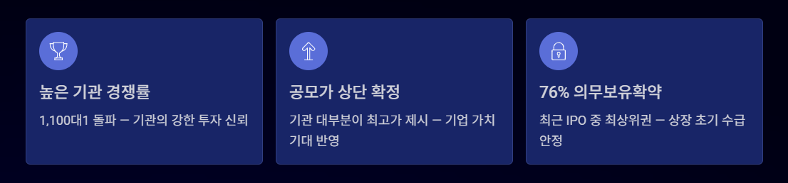 기관 경쟁률 1100대1 이상, 의무보유확약 76%로 최근 공모주 중에서도 긍정적인 결과로 평가됩니다.