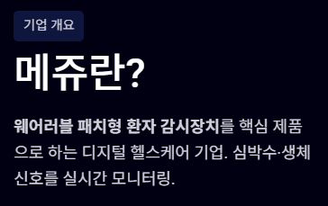 메쥬는 의료용 기기를 개발하는 디지털 헬스케어 기업입니다. 주요 제품은 웨어러블 패치형 환자 감시장치로, 병원에서 환자의 심박수나 생체 신호를 실시간으로 모니터링할 수 있는 장비입니다.