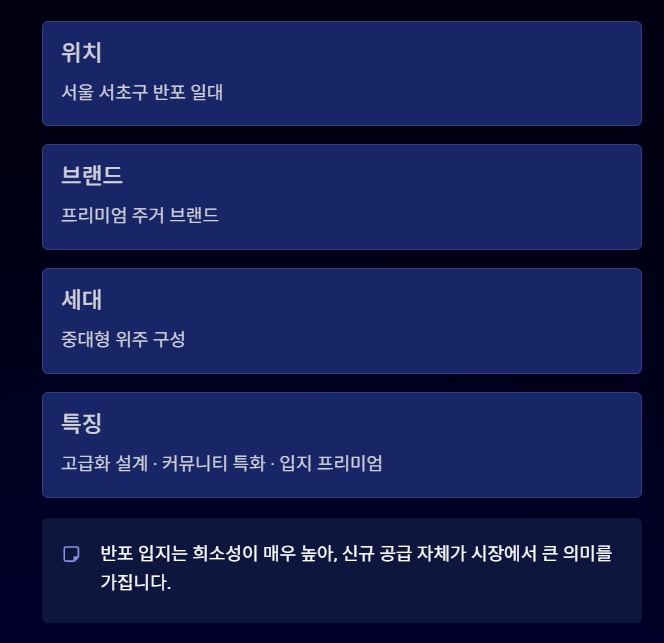 반포라는 입지 자체가 이미 희소성이 높기 때문에 공급 자체가 큰 의미를 가지는 단지입니다.