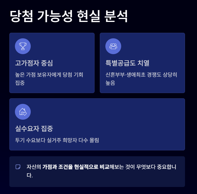 따라서 단순히 “넣어볼까?”보다는 자신의 가점과 조건을 현실적으로 비교해보는 것이 중요합니다.