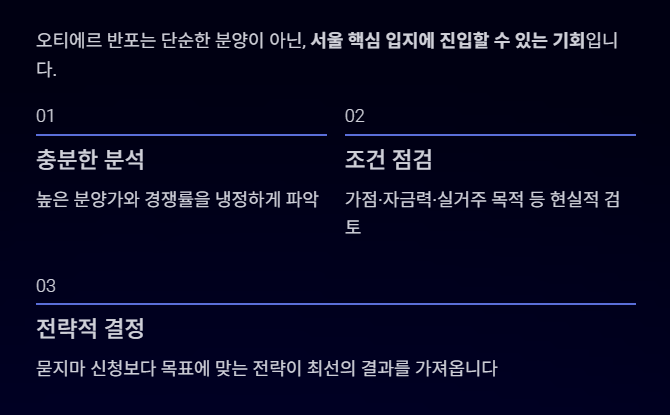 오티에르 반포 청약은 “입지는 확실하지만, 가격과 경쟁이 부담되는 고난도 청약”입니다.
