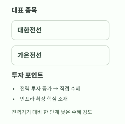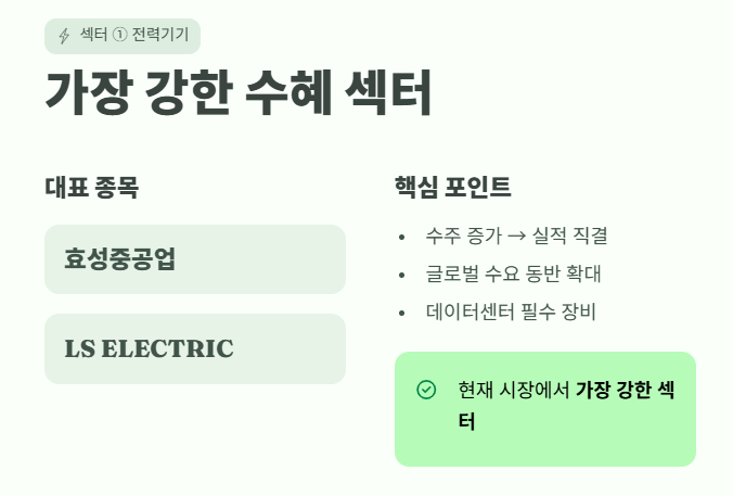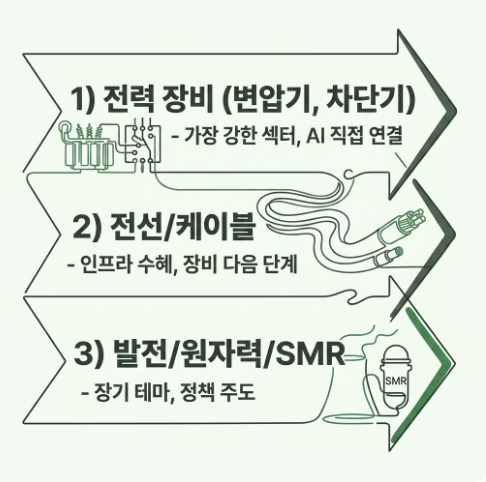 특히 전력기기 → 전선 → 발전으로 이어지는 구조 속에서