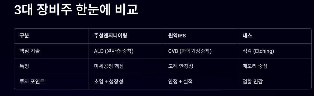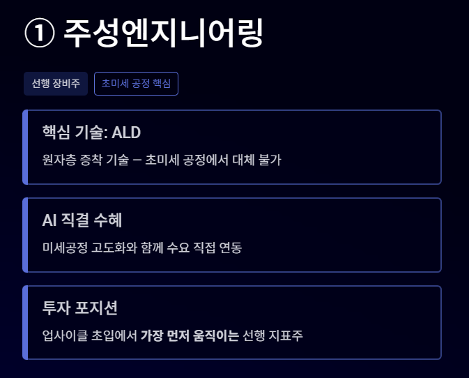 | 주성엔지니어링 | ALD | 미세공정 핵심 | 초입 + 성장성 |