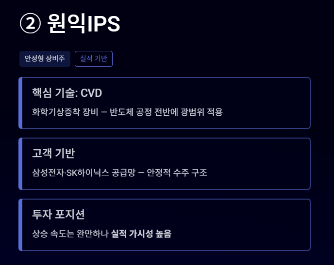 | 원익IPS | CVD | 고객 안정성 | 안정 + 실적 |