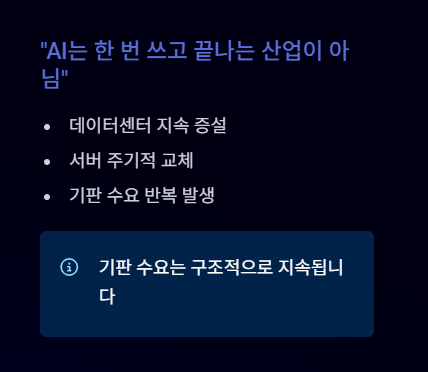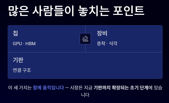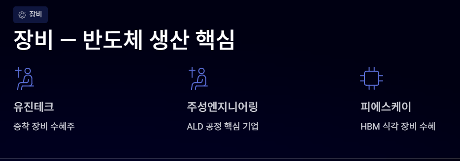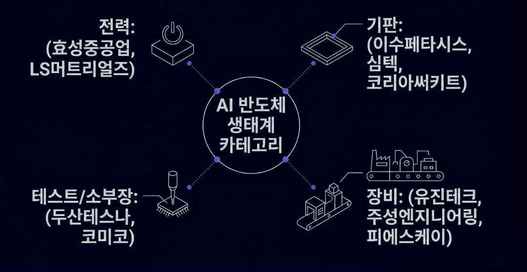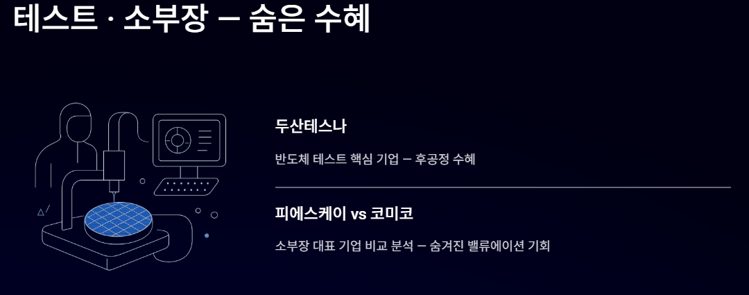 기판 → 장비 → 테스트 → 전력으로 이어지는 구조입니다.