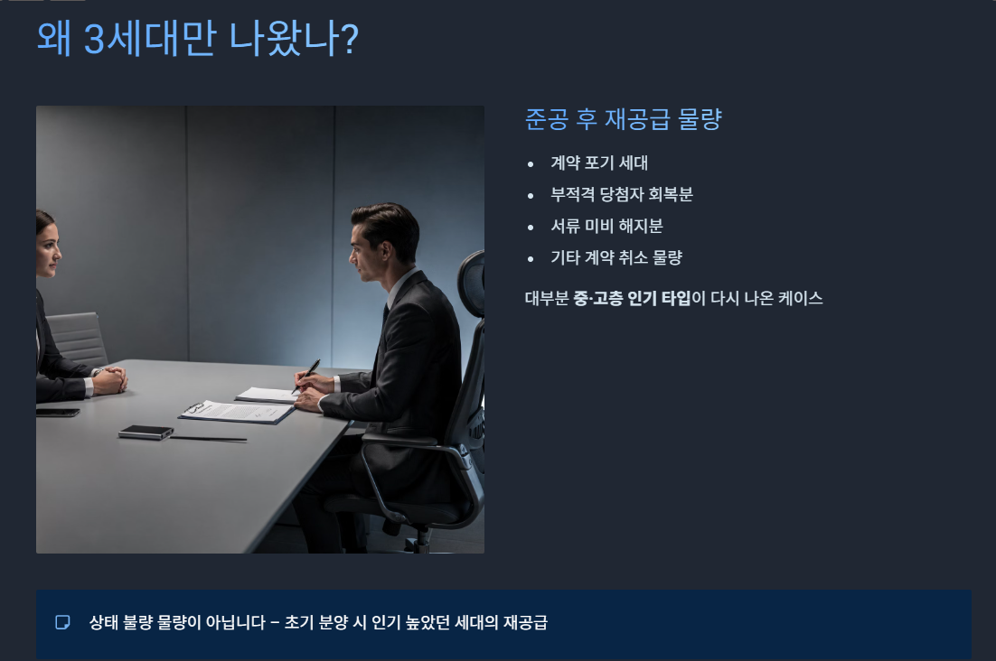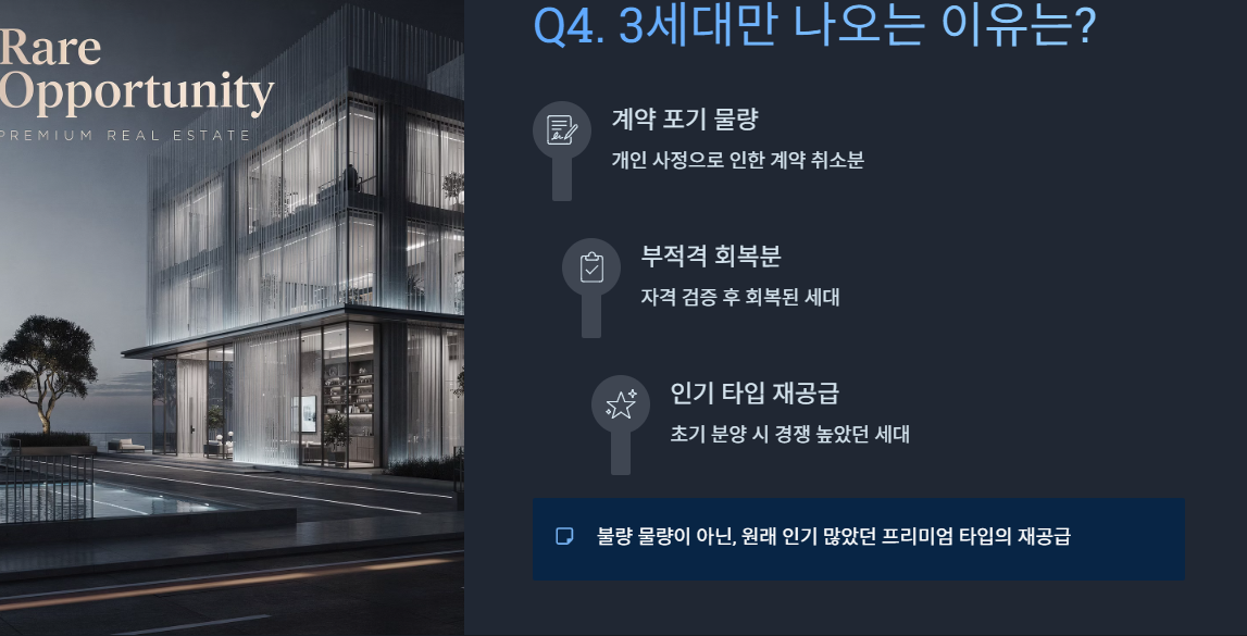 이번 3세대는 이미 완공된 단지의 고품질 세대가 저렴하게 나오는 유일한 기회입니다.