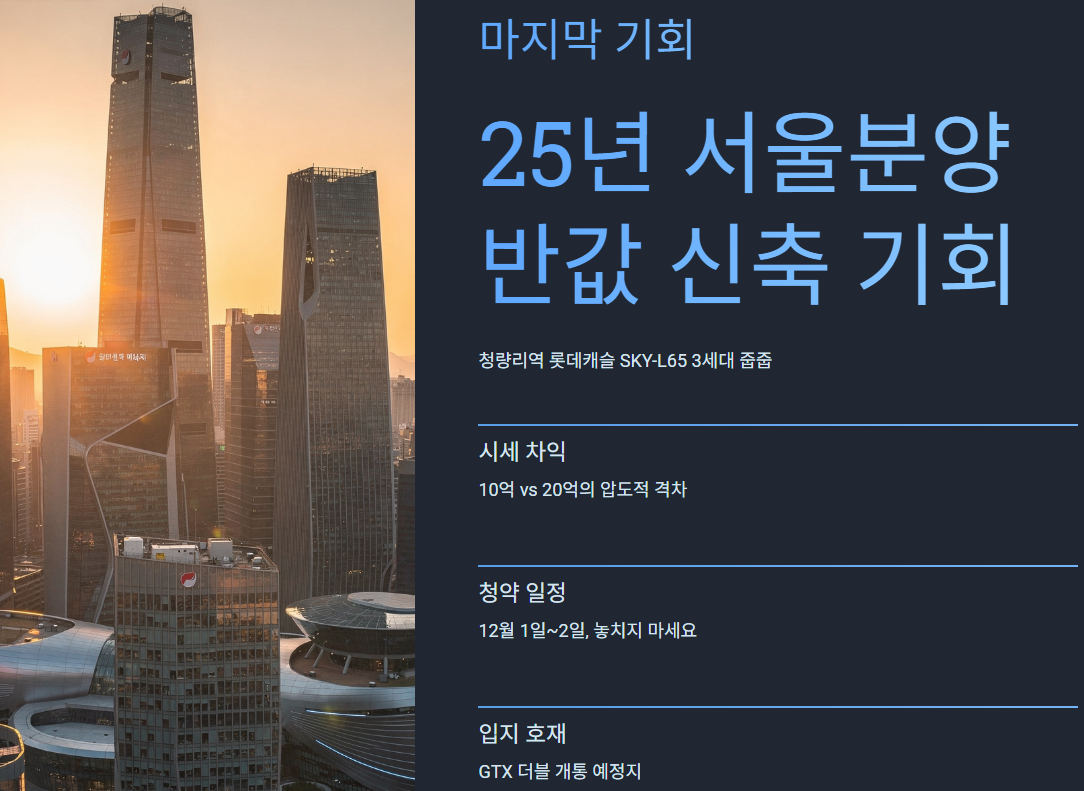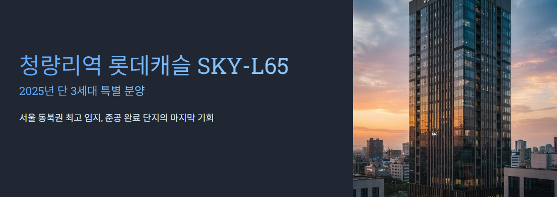 “청량리역 롯데캐슬 SKY-L65 3세대 줍줍은 2025년 서울에서 보기 힘든 ‘반값 신축 기회’입니다. 시세·청약일정·입지·준공 후 프리미엄까지 모두 정리했으니, 12월 1~2일 청약일정에 맞춰 꼭 확인해보세요.”