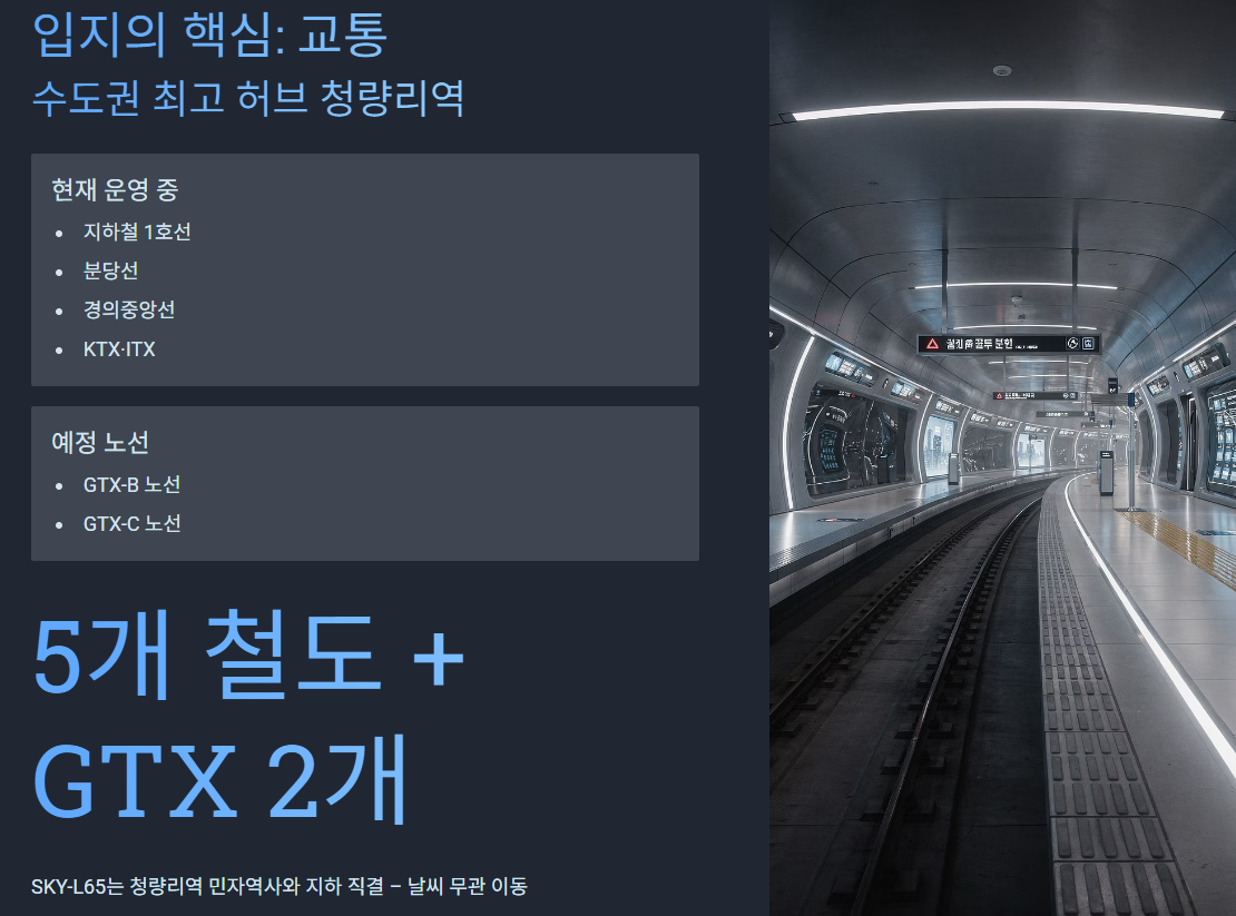 특히 SKY-L65는 청량리역 민자역사와 바로 연결(지하 직통)이라 비·눈·추위 상관 없이 이동 가능한 구조.