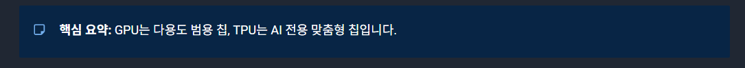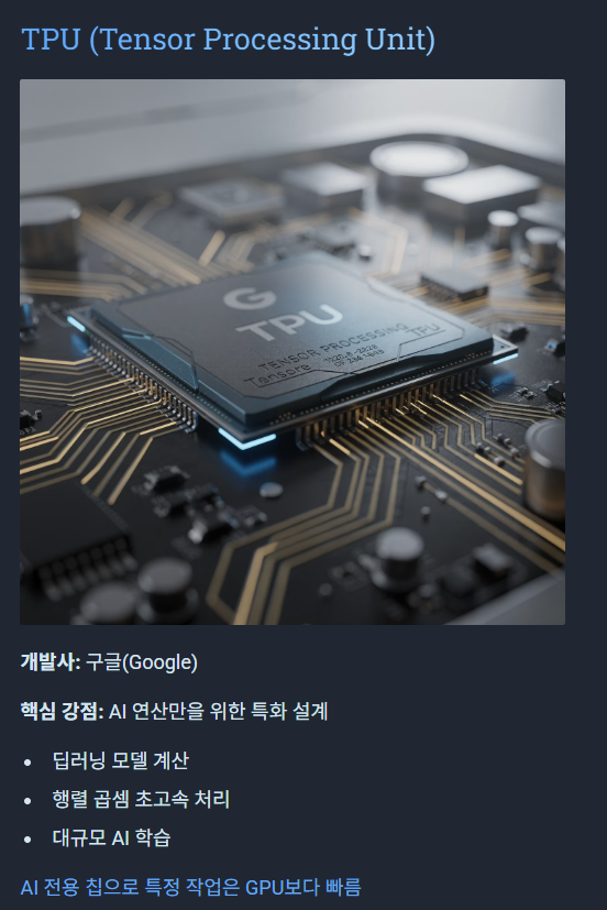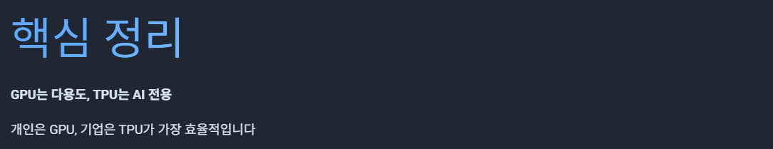 - TPU = AI 전용, 구글 생태계에서 가장 강한 편입니다.