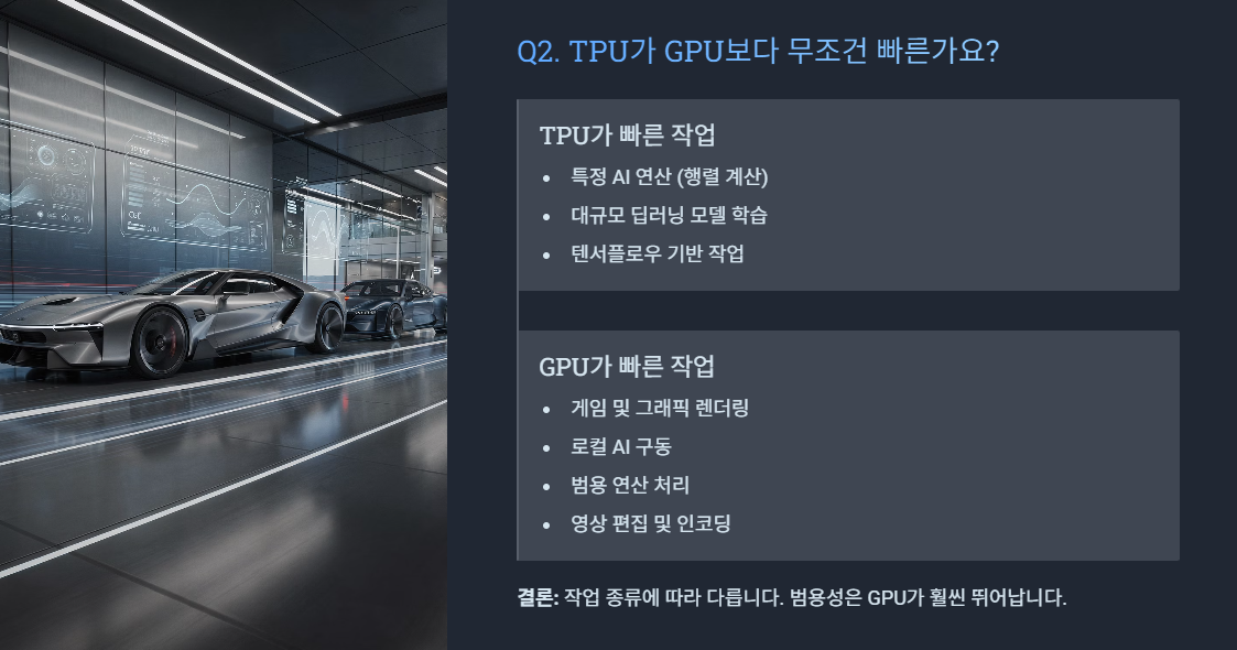 특정 AI 연산(행렬 계산)에서는 TPU가 훨씬 빠르지만,