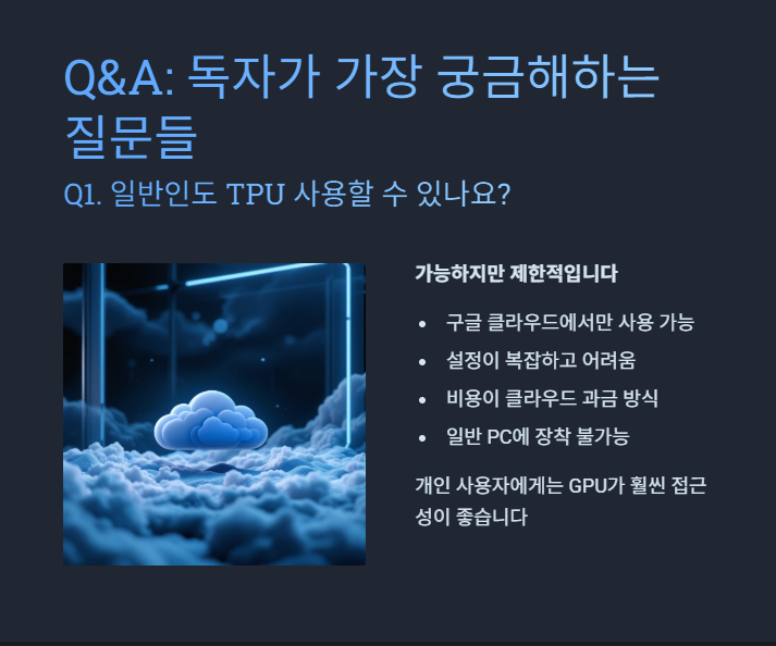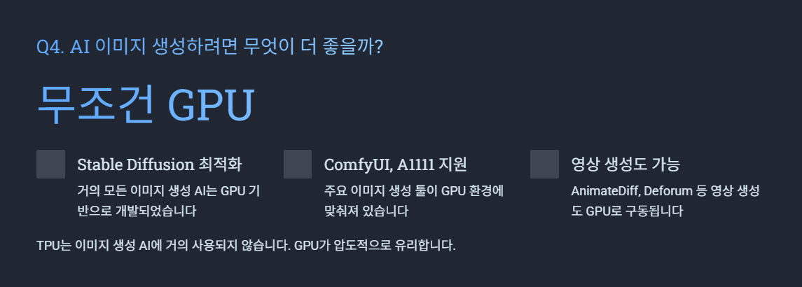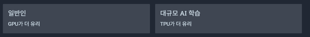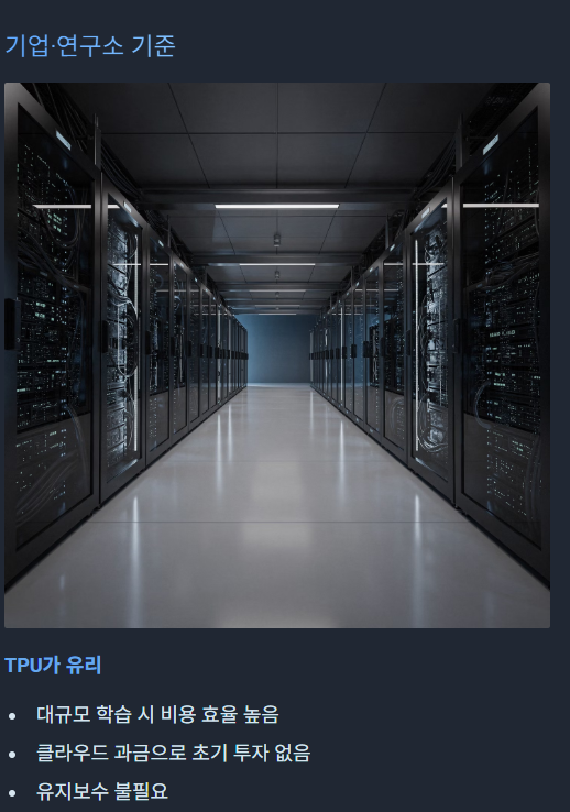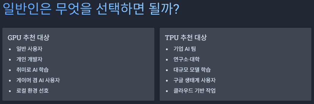 기업·연구소 기준에서는 TPU 가 더 유리하고 일반인은 GPU 가 더 경제적이며 유리합니다.