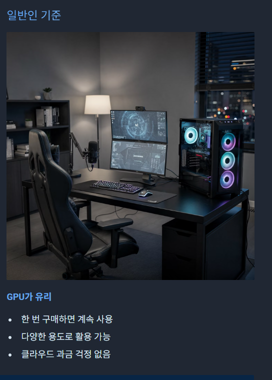 설정 난이도·사용 환경·비용 구조를 보면 PC 기반 사용자에게는 GPU가 압도적으로 편리합니다.