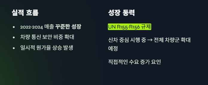 - 영업이익은 차량 통신 보안 비중 확대로 일시적인 원가율 상승이 나타났습니다.