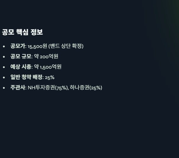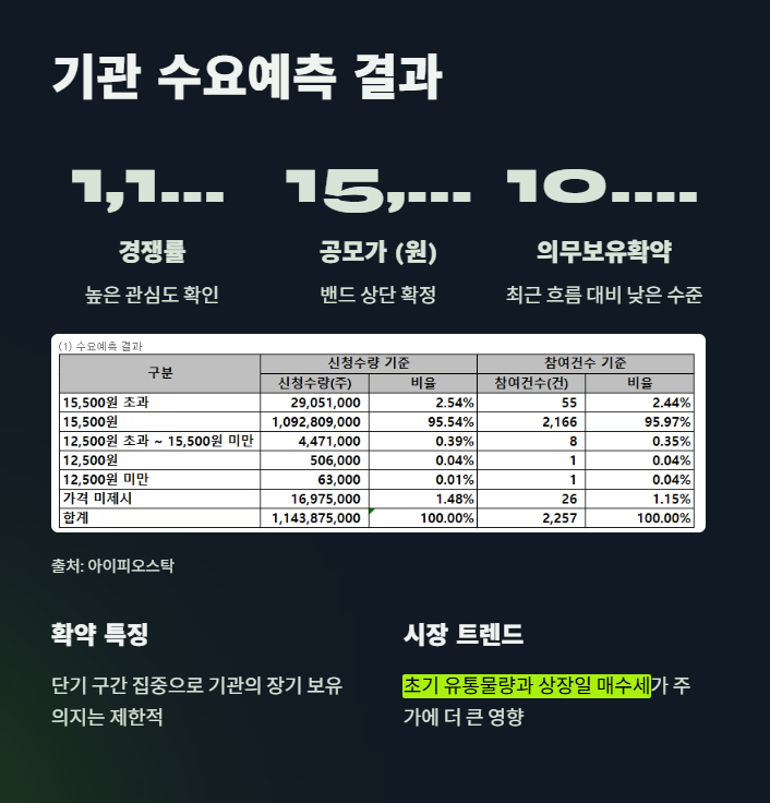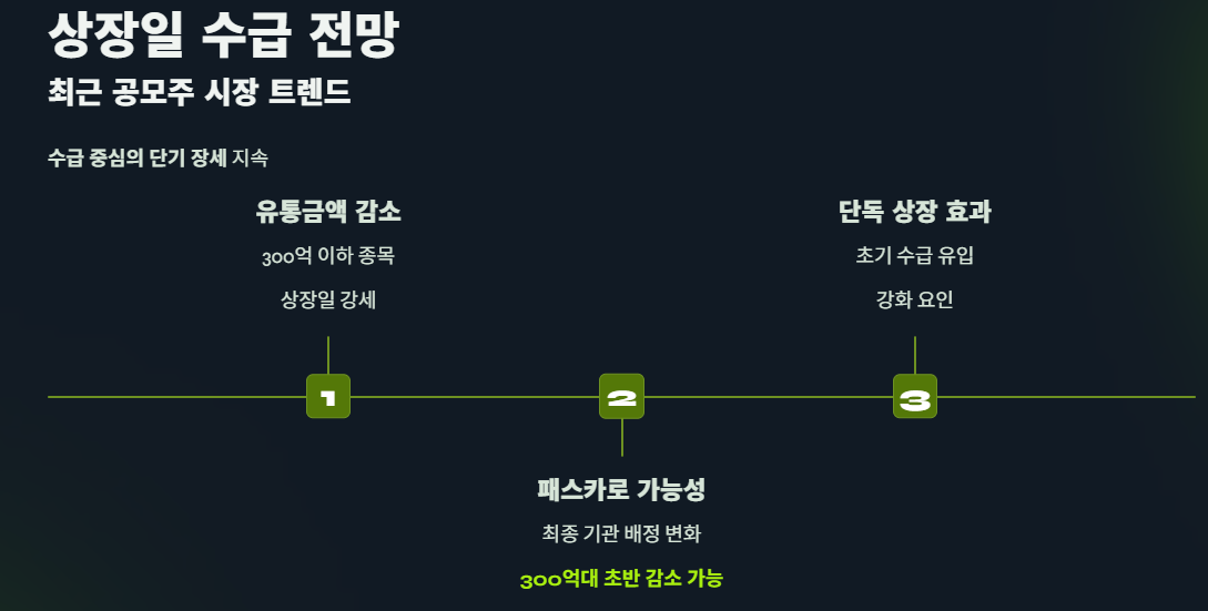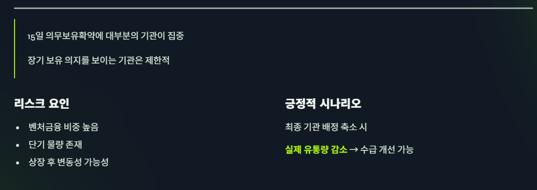 다만 최종 기관 배정에서 물량이 축소될 경우 실제 시장 유통량은 크게 감소할 가능성이 있으며, 이는 상장일 수급 개선으로 이어질 수 있습니다.