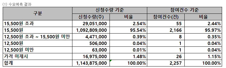 15일 의무보유확약일에 대부분의 수요예측결과의 기관들이 몰려있습니다. 장기간 보유하겠다는 의지를 보이는 기관이 많지는 않습니다.