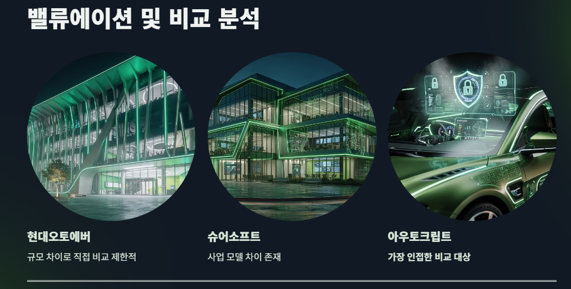 현대오토에버와 슈어소프트가 제시된 비교 기업이지만 규모·사업 모델 차이로 직접 비교는 제한적입니다.