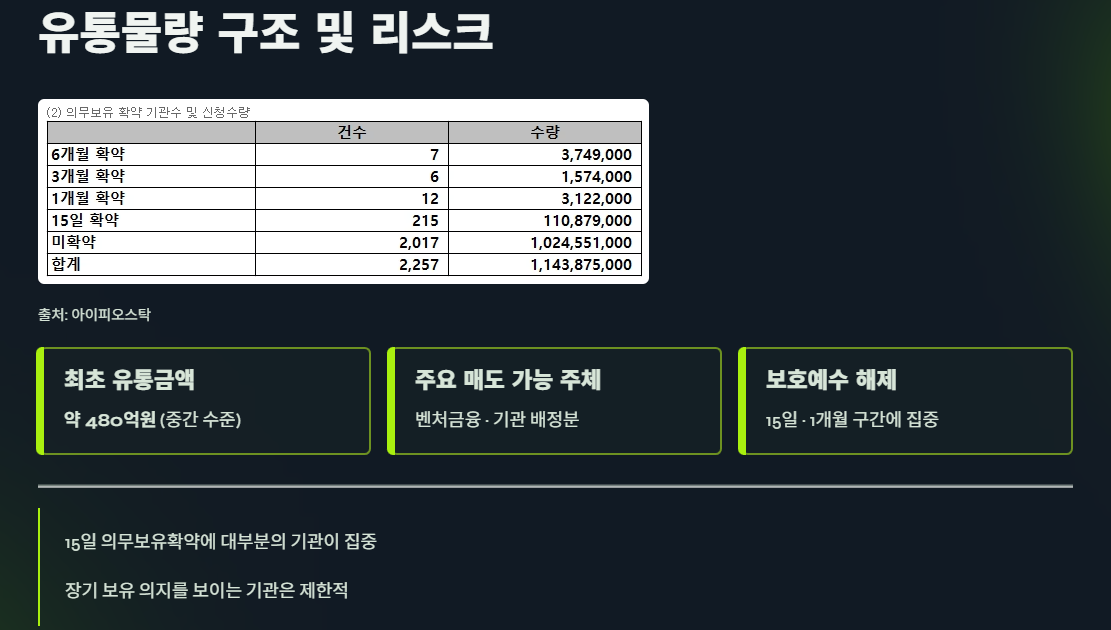 유통금액은 중간 수준이며, 벤처금융 비중이 높고 단기 물량이 존재하는 점은 상장 이후 변동성을 키울 수 있는 요소입니다.