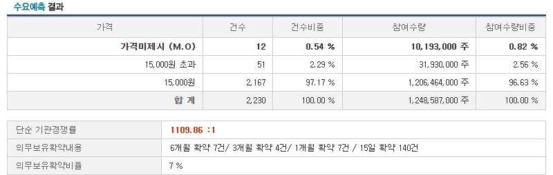 이지스는 기관 투자자 수요예측에서 1,109.86 : 1의 높은 경쟁률을 기록했습니다.