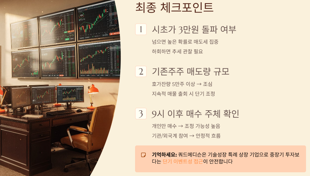 아래에서 쿼드메디슨의 오늘 상장 전략을 핵심만 정리해드립니다.