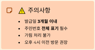 모든 서류는 발급일 3개월 이내여야 하며, 주민등록번호 전체 표기 필수입니다.
