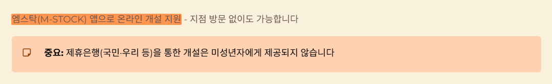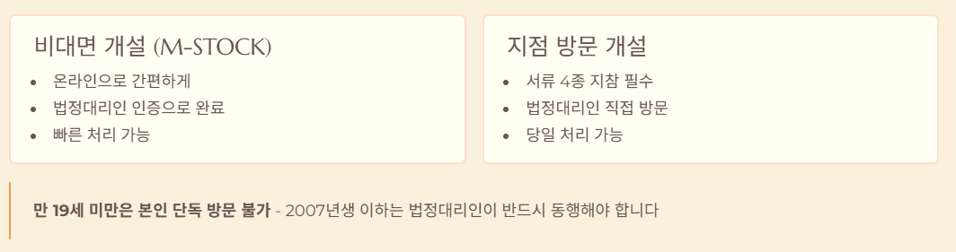 다만, 제휴은행(국민·우리 등)을 통한 계좌개설 방식은 미성년자에게 제공되지 않습니다.