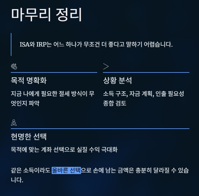 ISA와 IRP는 어느 하나가 무조건 더 좋다고 말하기 어렵습니다.