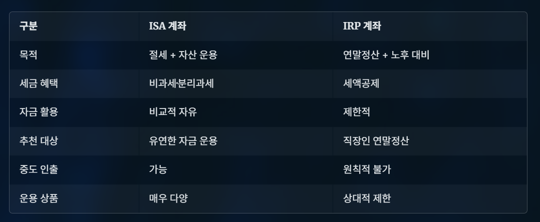 | 구분 | ISA 계좌 | IRP 계좌 |