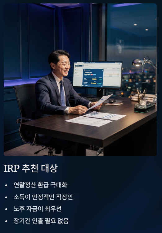 - 연말정산 환급이 중요한 직장인 → IRP