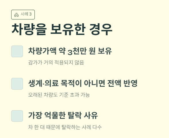 특히 집, 예금, 차량 등 재산 요소 하나만 달라도 수급 여부가 달라질 수 있어, 미리 자신의 소득인정액을 계산해보는 것이 필요합니다.