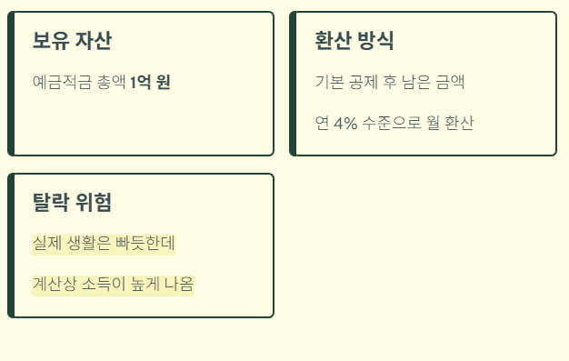 “기초연금은 단순한 월급 기준이 아니라, 재산과 금융자산을 모두 월 소득처럼 환산해 판단합니다.”