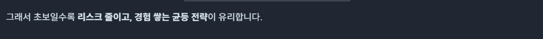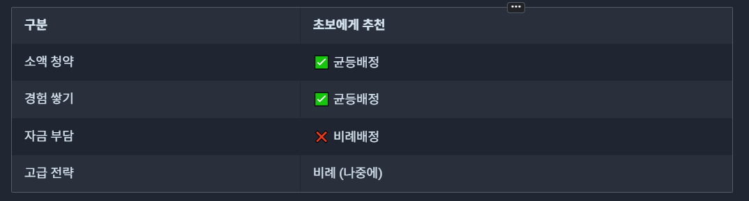 리스크 줄이고, 경험 쌓는 균등 전략이 유리합니다.