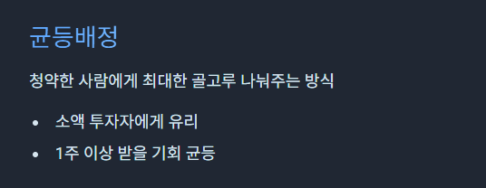 - 균등배정: 청약한 사람에게 최대한 골고루 나눠주는 방식