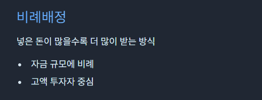 - 비례배정: 넣은 돈이 많을수록 더 많이 받는 방식