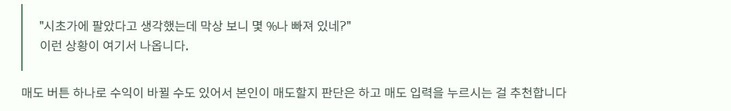 “매도 버튼 하나로 수익이 바뀔 수도 있어서 본인이 매도할지 판단은 하고 매도 입력을 누르시는 걸 추천합니다.