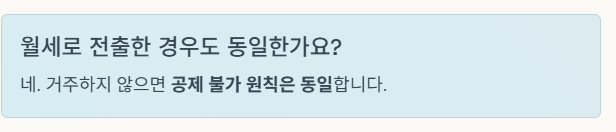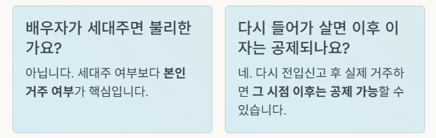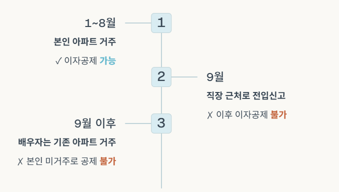 배우자가 계속 거주하고 있어도 *공제 기준은 ‘본인 거주 여부’*입니다.