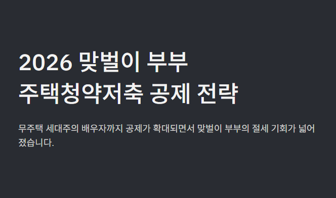2026 연말정산에서 주택청약저축 공제가 무주택 세대주의 배우자까지 확대되면서 맞벌이 부부의 절세 전략이 달라졌습니다.